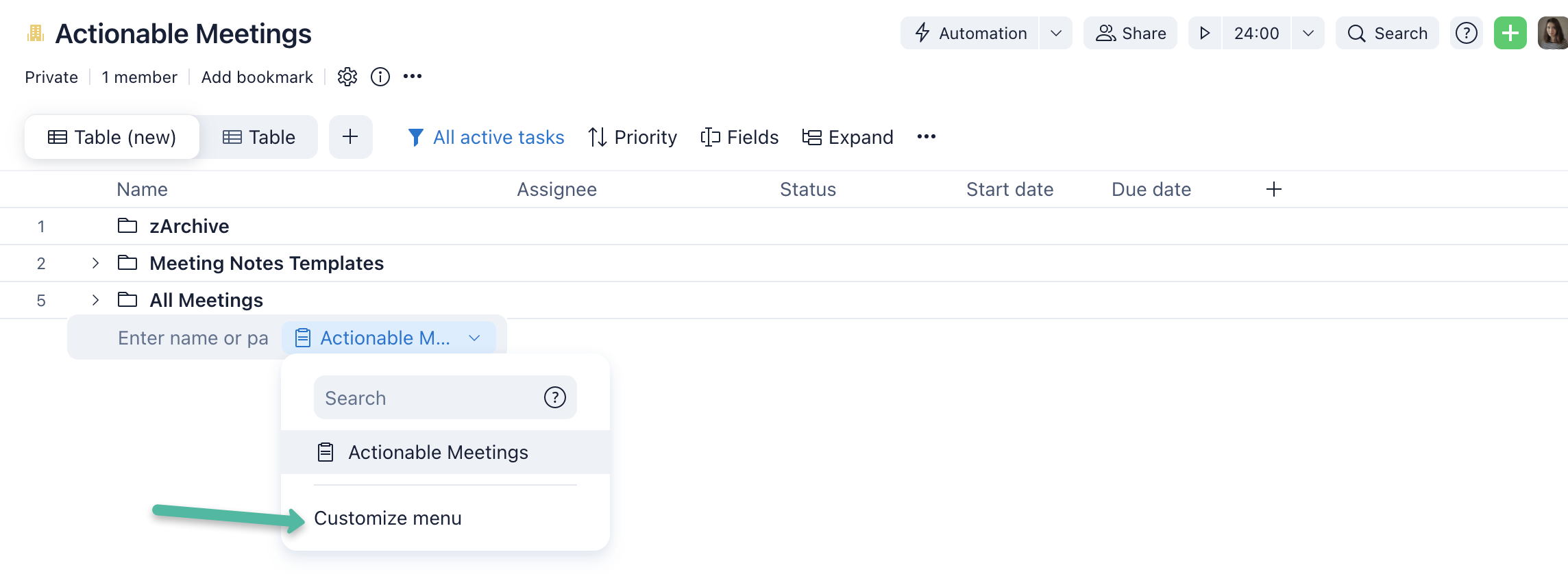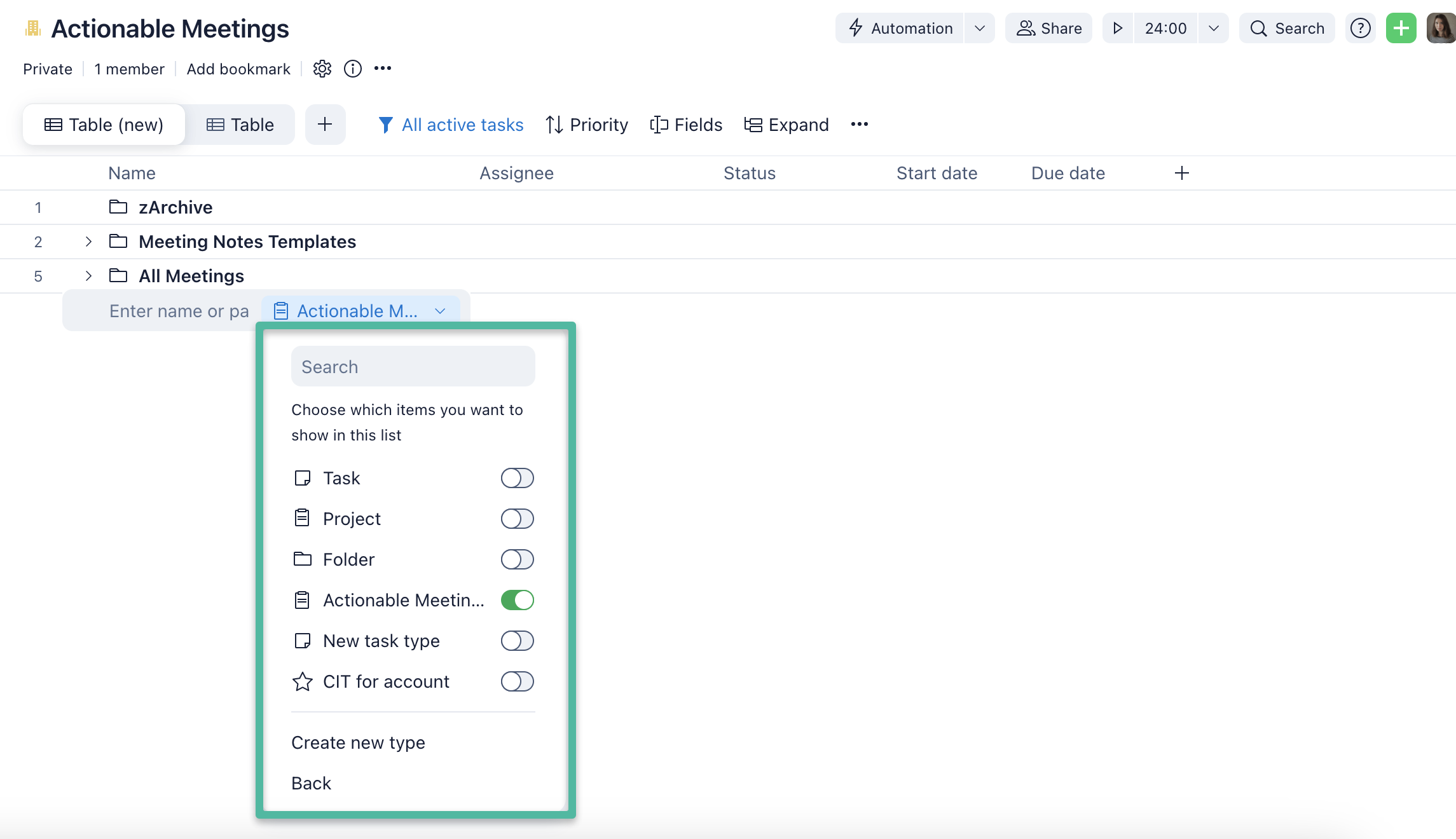 Hi Sven Passinger! It's possible to manage custom item types suggestions. For example, you can manage those suggestions for a specific folder or space by clicking on "+ Item", and then "Customize menu":