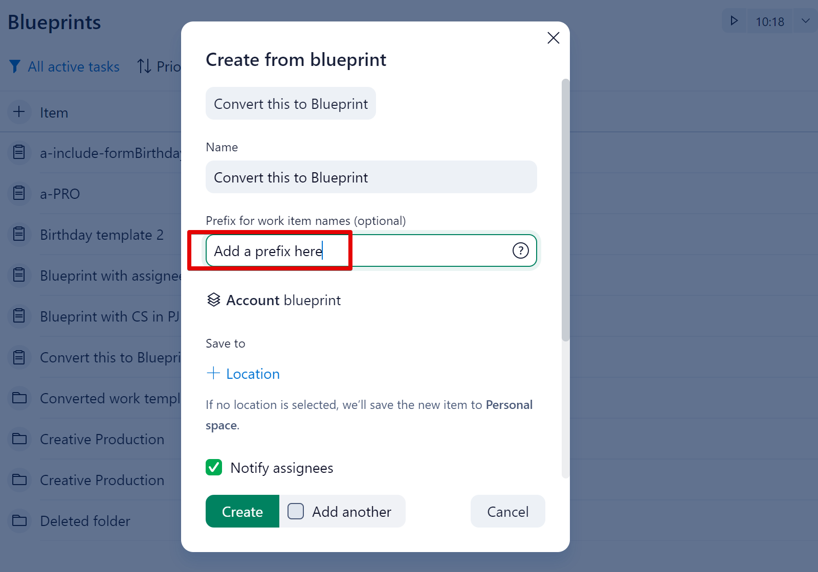 When I create several projects from a Blueprint I get the several folders with the same name , how can I quickly differentiate what project does each task belong to?