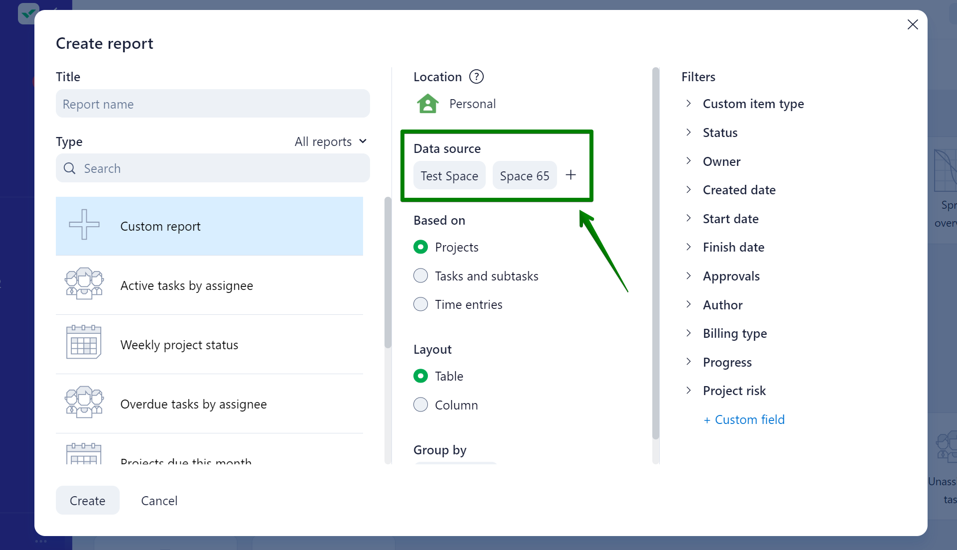 Hello Anna Fisher-Pinkert, welcome to the Community! You should be able to create a report based on projects whose data source could be multiple Spaces: