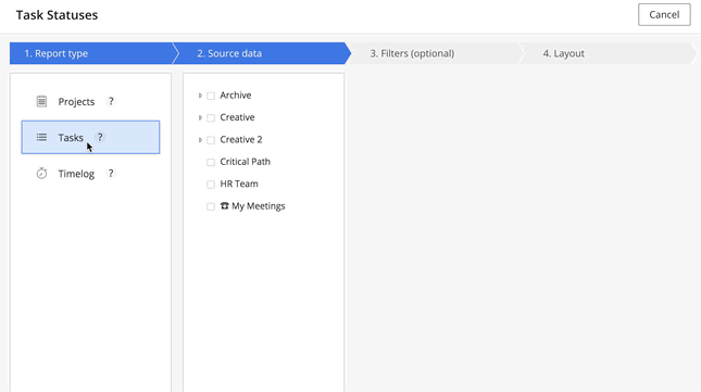 Create a Task Report named, for example, "Task Statuses". Use the Report Builder to choose the Folder(s) that hold the Tasks you want to show in the Report. Now add any filters you think are appropriate (I've haven't added any filters to my report below) and then choose to Group the Report by 'Status' in the last section. Click Save & View.