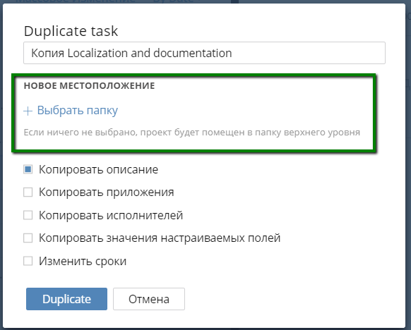 Если местоположение не выбрано, задача будет создана в Папке верхнего уровня. Таким образом вы сами выбираете, куда именно будем помещена задача.