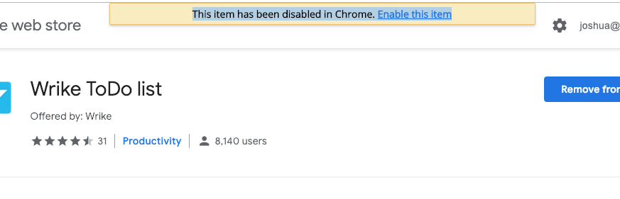 Today Chrome kicked me off the ToDo list. it says "This item has been disabled in Chrome. Enable this item" When I try to it just kicks me back!