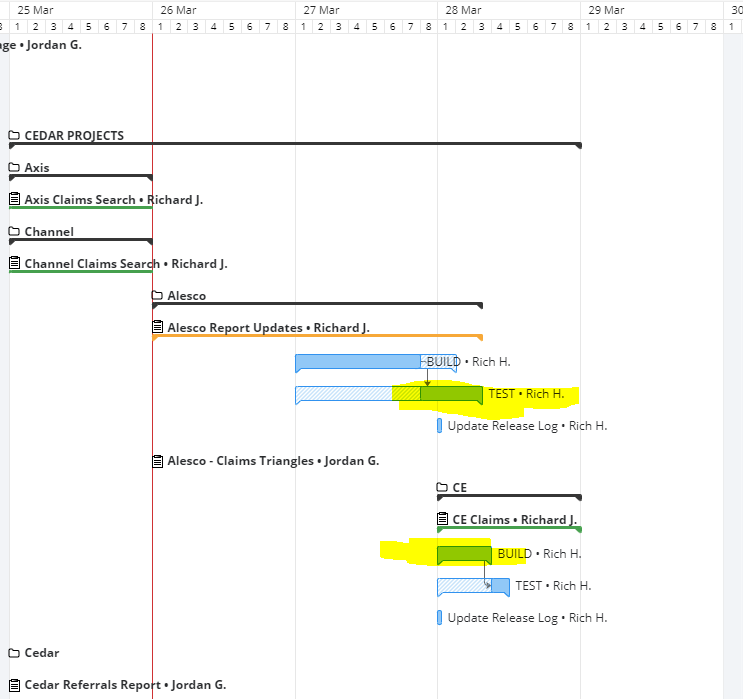 We have set up several project folders with further projects, tasks and sub-tasks within. Below is a screenshot of the high level Gantt chart. I have highlighted two high level tasks for Rich H. Because they are on separate projects Wrike has allowed work to conflict, but without raising as a conflict.