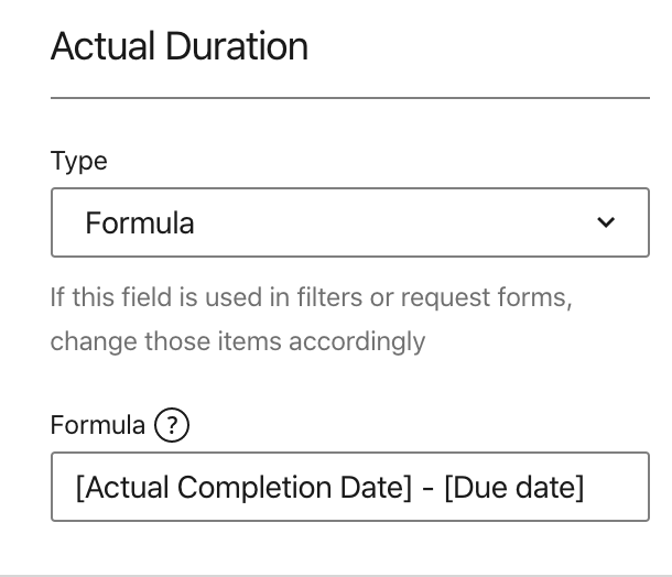 Then you can create your calculated custom field according to the instructions in our Help Center. Using the "Actual Completion Date" custom field already created and the "Due date" system field, you should be able to setup your calculated custom field for "Actual Duration":