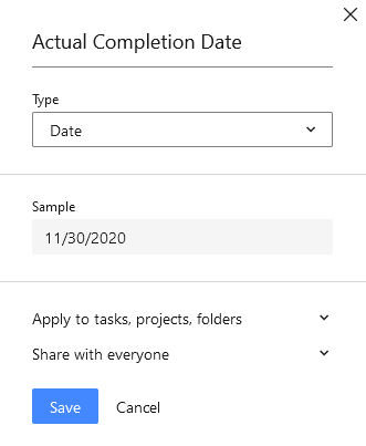 Can you do this formula with a custom "completed date" field? Wrike will not allow me to save it when I try. The reason I need the custom field, is I am coming into a project mid-cycle and we are just moving into Wrike. Anything I add that was already completed prior to me joining the team will not allow me to mark the actual completion date - it only tags it as of today, which is inaccurate. I am trying to reflect the entire project - not just when I came on moving forward.