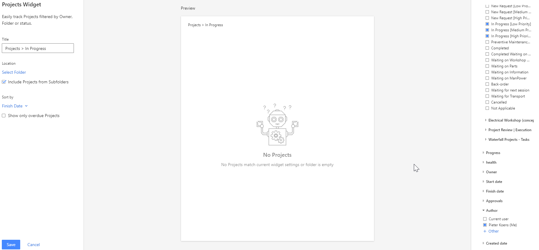 So i have one for all my ongoing projects. I myself am the author of the request and so this dashboard will show all my projects with the status in progress. If you make one, you could duplicate it for each person so that they only see the projects and tasks on their dashboards without having to have access to the space.