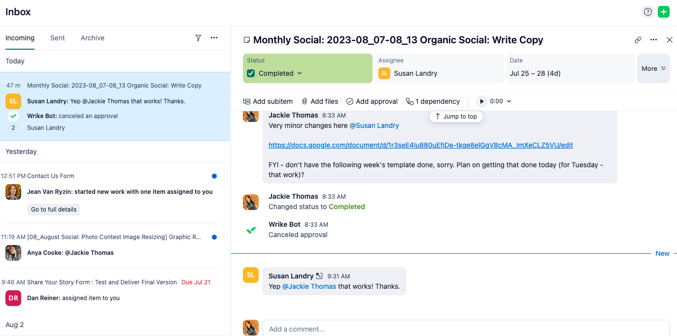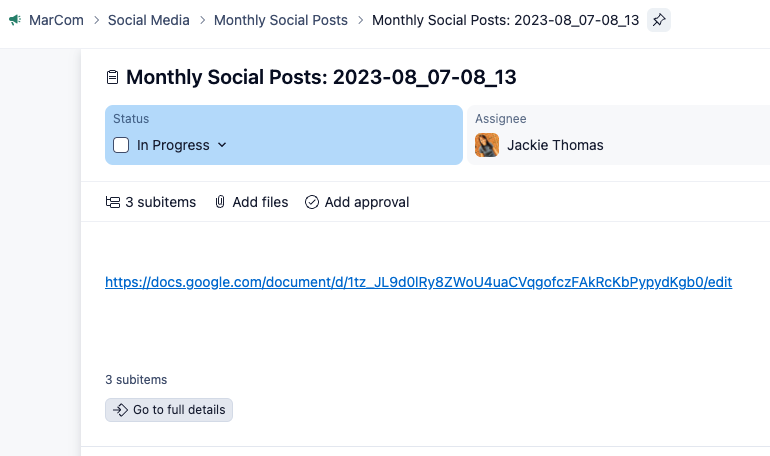 Now I can see all the tasks in the project and see the status/where this is, etc. (and another piece of feedback, why did you all collapse all the info at the project level pane? It looks just like the task level - shouldn't those be distinguished? Meaning - if I'm trying to read everything at the project level and I've had to frame of reference, the whole point here is that I'm getting up to speed. You all collapsing that view makes that difficult).
