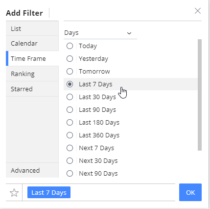 6. When the filter menu pops up, select "Time Frame", "Days" then "Last 7 Days"