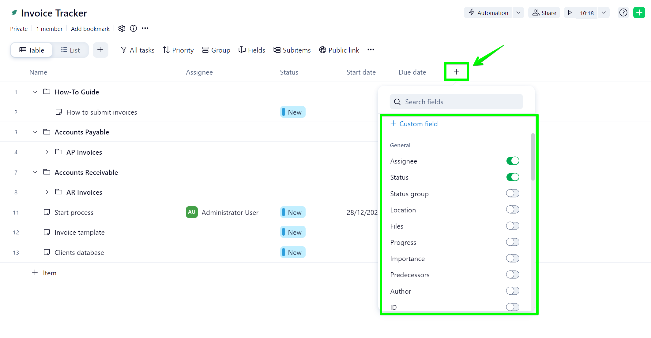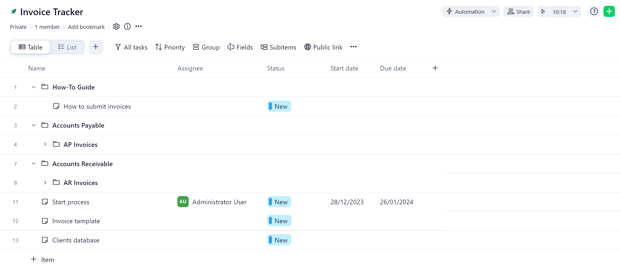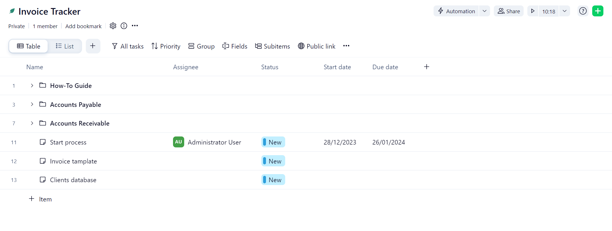 2- Includes the benefits of the List view and provides you with a large number of additional options. Just to mention a few, you can see subitems: