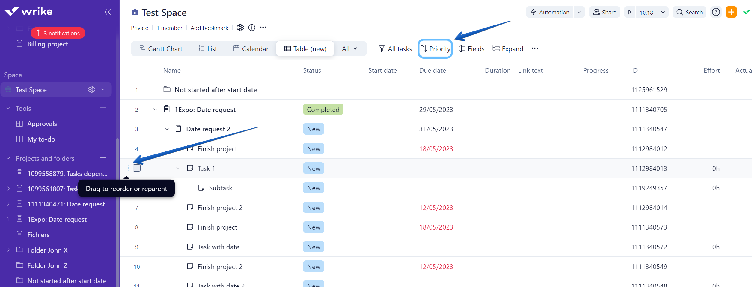 Hi @..., thanks for your response. Your suggestion, while appreciated, is just not a solution to this gap. Looks like this suggestion may be the de facto response when this question comes up (see Lisa's post farther up the thread). We just want the ability to list things in an order we want. This feature seems to exist on almost every other platform I've seen. There is even a feature already in Wrike that enables you to drag tasks around (see image below) but only allows you to drag and drop to create an indent (looks like sub-task/indent type of function?). I've already had multiple teammates come ask me if we actually have to stick with Wrike and we've only been using it a week. They want to switch because something as simple as this seems to be a no-brainer to most of the team. I love a lot of the features in Wrike, but if the tool isn't easy/convenient to use (a major value add for a tool the enables organization and structure) then those great features can't be leveraged. I'm sure I'll be asked about my thoughts on Zoho and Asana soon enough, and I won't be able to go to bat for Wrike and defend it as strongly if people simply don't like using it for simple gaps like this. Resolving this small-yet-impactful strange gap in functionality would go a long way to enabling easier use and simpler/greater functionality.