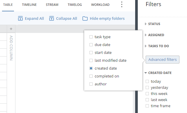 2) In Table view we can select different date range (i.e. for tasks that are due for), but we're not able to select filter that would say that in this date range users spent so many hours doing different tasks. In advanced filters: