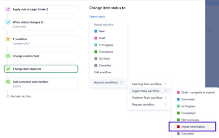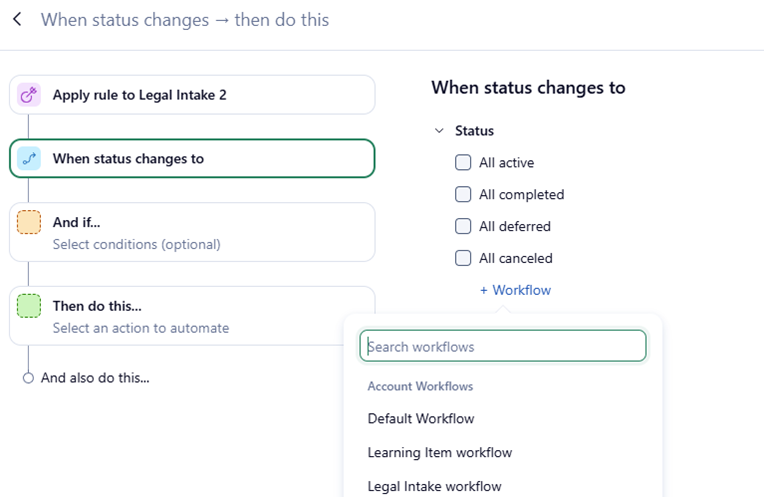 The ‘apply rule to’ should automatically be set to your custom item. Click on ‘When this happens…’ and pick ‘Status changes to’. The default workflow appears, click on +Workflow to pick your custom workflow.