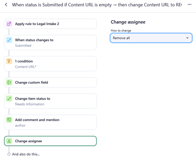 If these conditions are present, then I change that same custom field to display ‘REQUIRED’ and I set the item status to ‘Needs Information’, I remove all assignees and I have a message sent to the author alerting them to the missing information giving the extra direction to look for ‘REQUIRED’. For text box fields you can just type this in here. For single select or multi-select fields ‘REQUIRED’ needs to be an added choice option. For dates/numbers, I set those to be marked red if empty.