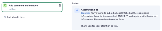 To prevent submissions with REQUIRED as the response. I created another automation rule like the above example, except instead of looking for ‘is empty’, I looked for ‘is exactly’ (in the case of text boxes) REQUIRED or simply looked for REQUIRED for single/multi-select fields. I dropped the ‘Change custom field’ step but continued the same with the rest. NOTE: the automation rules uses AND logic. Without the OR option, you have to create a set of rules for each required field. Depending on the number of required fields, you may end up with many automation rules. I used ‘duplicate’ while creating the rules I needed and kept mindful of adjusting the rule name.