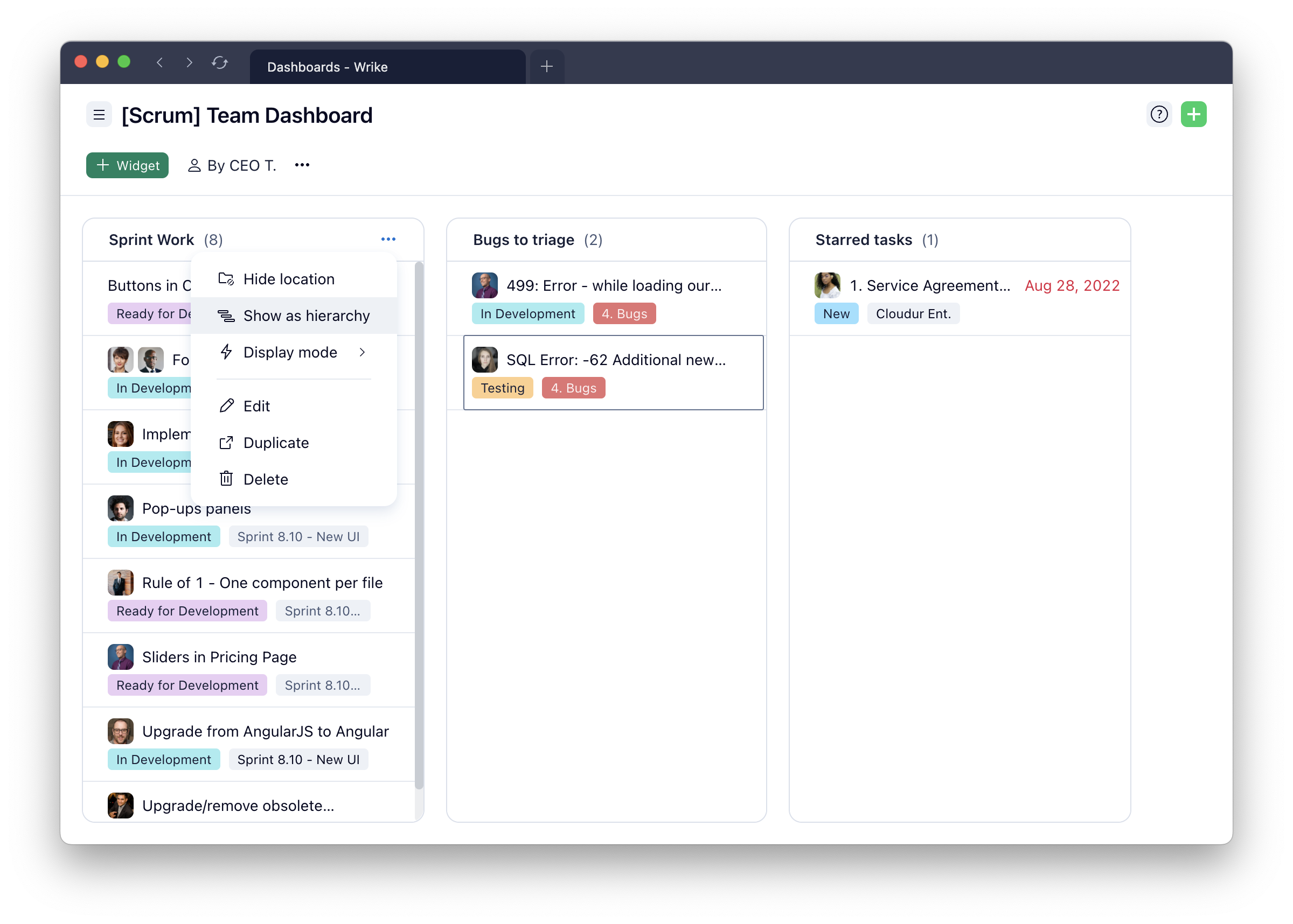 Our dear customers and users, the functionality of displaying items in the dashboards either as a flat list or as a hierarchy is now available in Labs. You can toggle between two modes using the corresponding command in the table widgets' menu. In addition to that, you can also easily show/hide locations (folder names) and switch between responsive (auto, based on the width), list, and table modes.