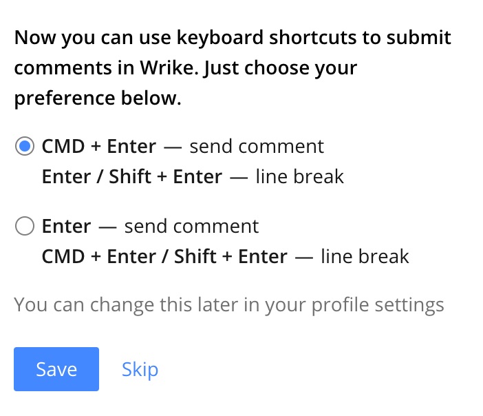 You can choose your 'send' option for comments setting in your Wrike profile settings. When you first attempt toย write a comment in Wrike you'll see the below pop up so you can make the change there and then.