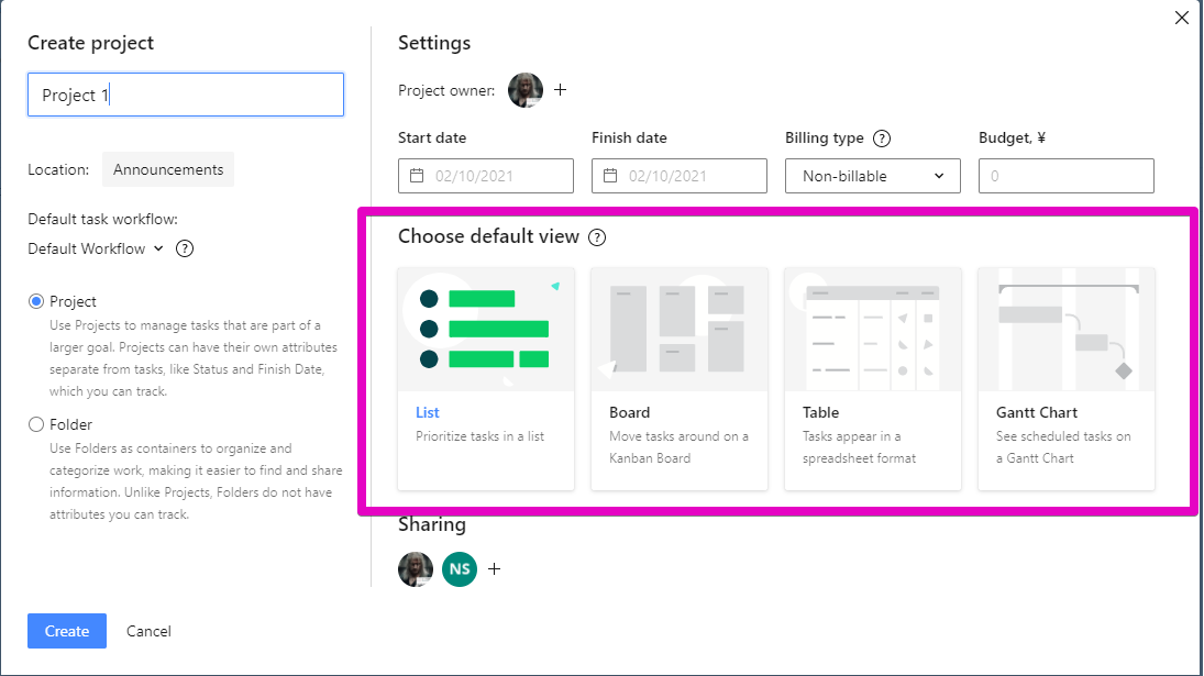 During the Project/Folder creation users can set the default view that may be different from the default view set for Space: