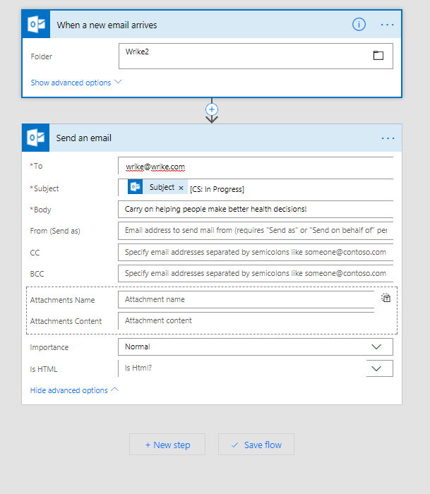 - Set up a dedicated email inbox for the Wrike bot emails... this can be a little tricky as you may get notifications for other users, but you only want YOUR tasks to fire off the Flow. We are using Outlook's rule that checks the body for "<Your Last Name> All the necessary task dependencies have been completed, so you can start working on it right away." and files it in a Wrike mailbox. Flow works with many different email programs I believe...
