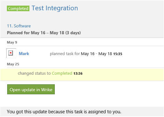 Wrike notifications include only the task name. I work on multiple Wrike projects, and typically don't create the tasks which are assigned to me; i.e. my project manager creates Wrike tasks, and then I derive low level Jira (software) tasks (I don't use an integration. Is there one?). So at this time I don't really use Wrike much; it's more used by my project manager.