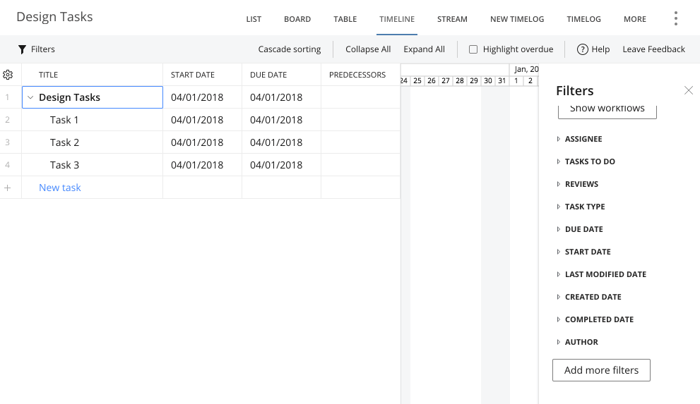 In the new Timeline view the timelines are not filtered so all tasks show even ones without "Design" in them this isn't easy to view in our review meetings.