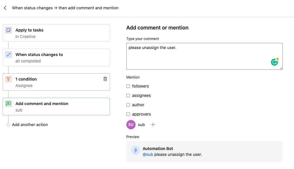 Hi Justin Coetzee, we don't have an automation rule to unassign a user. I can recommend setting up a rule that reminds a user to remove the assignee if the task status is completed. You can also add a condition if the assignee is a collaborator by creating a collaborators group.