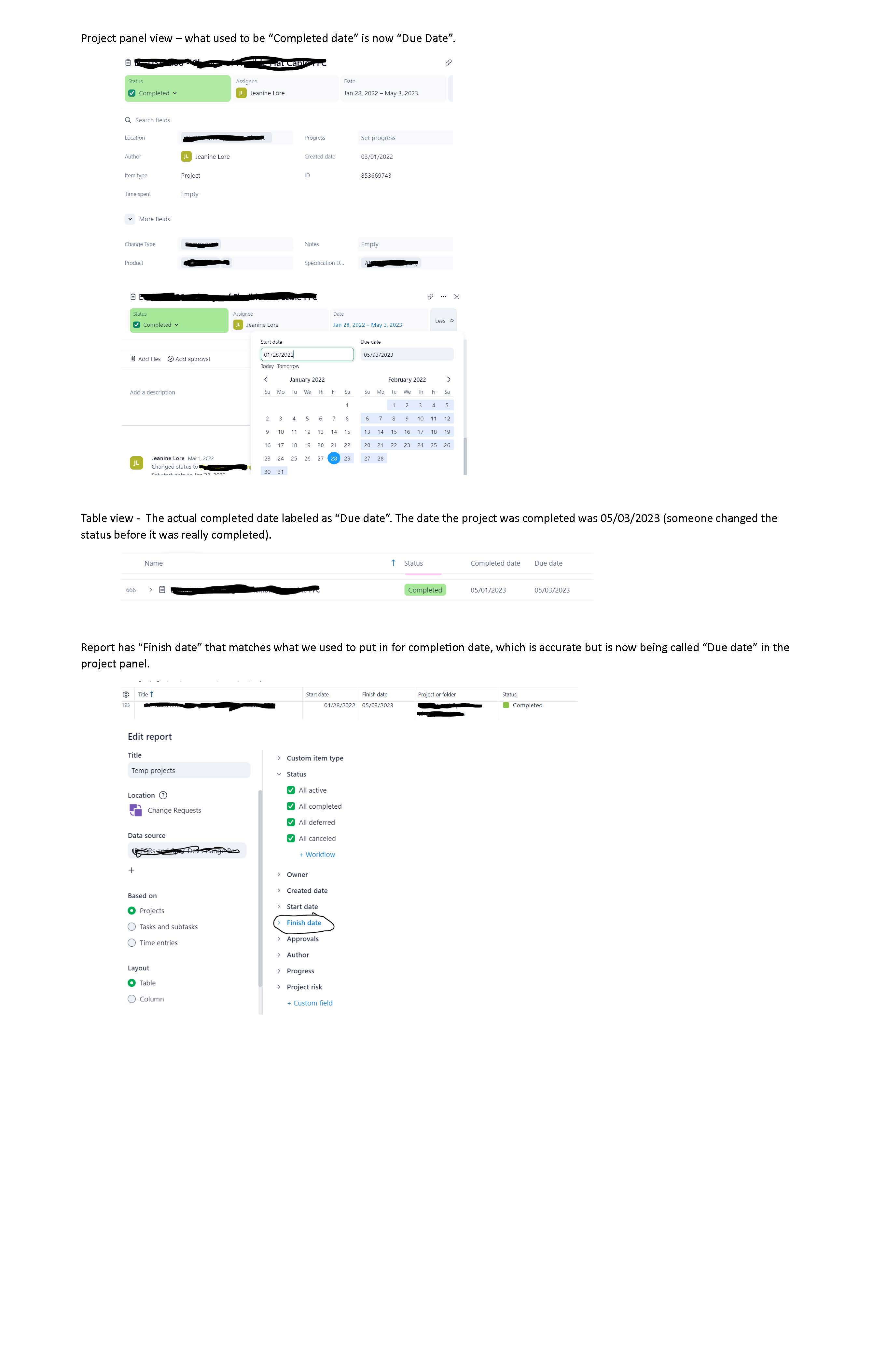 As shown in the image I posted, the "Finished" date used in the reports as a filter as well as a header is what is now called the "Due date" in the project panel.ย It is very confusing and they should have left the user interface project panel to say "Completed" not "Due date".ย I will continue to enter the completed date as the due date and I guess just deal with our users constant confusion.