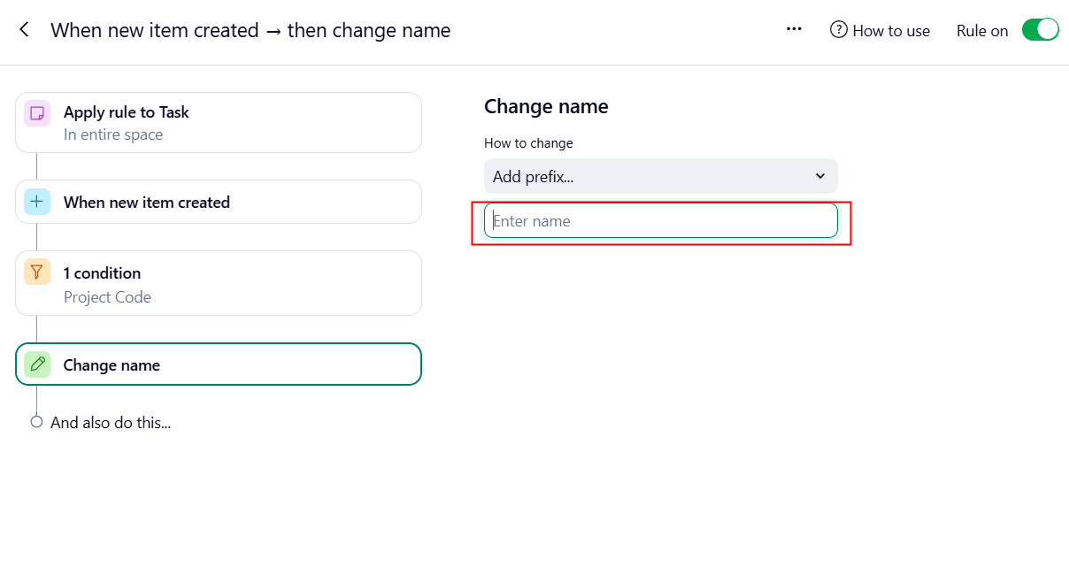 - Select the condition โChange nameโ and choose the option โAdd prefixโ. Type the prefix youโd need to include in your itemโs title.
