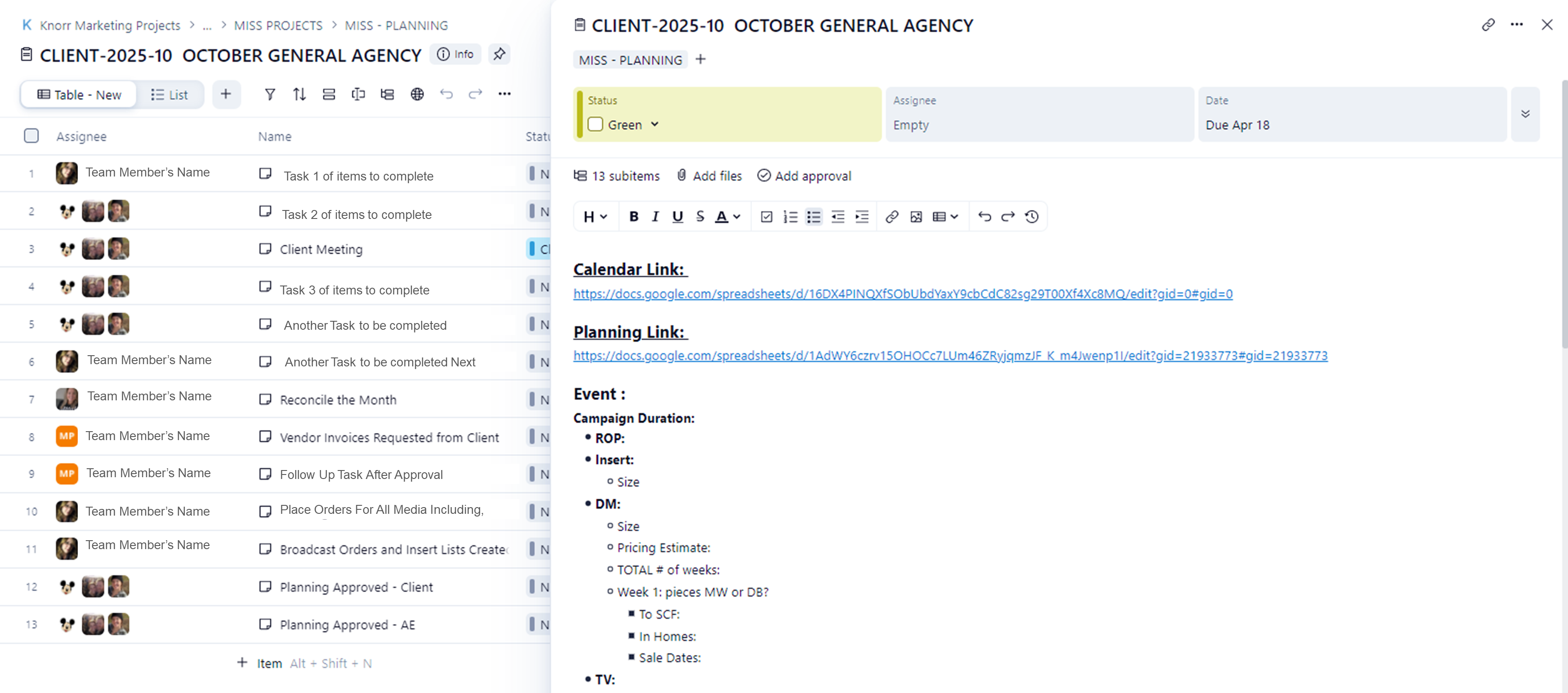 Hey Lisa, I just wanted to share that LIST VIEW works so well for us because of its ability to stay compact and display all of the information without a table.  Tables lock items into a grid with designated spaces for each piece of information.  When i an working on the main screen (Info Screen) of a task and need to reference the sub tasks under that task, I can glance over to the column list of sub-tasks on the left of the Info window and see every sub-task, its due date, who it is assigned too, and its status.  In the Table view, I can't see all of this information without scrolling to the side or first closing the Info Screen to see the whole table to then go back to the info screen to add notes, direction, etc.  Removing columns from the Table view doesn't help.  I need all of the columns we use and all of the information in those columns.  I need it to be compact like list view so that at a glance I see all the information, not having to close a screen to find the info to then re-open the screen to enter the direction and notes needed for the team. This may just sound like a couple of clicks but when I am working on hundreds of tasks and jobs a day, the amount of time I loose clicking and waiting for information to populate will dramatically slow down my efficiency.  Not just a little bit.  I am talking a LOT.  I am pleading and praying that you will please keep list view.  🥺 🙏