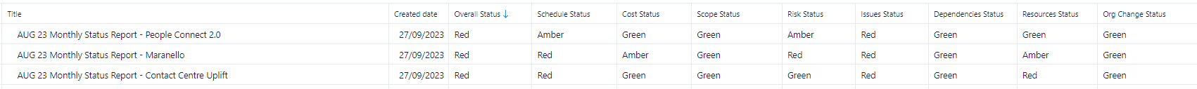 So I have a report that has a series of custom fields called "Schedule Status", "Cost Status", Scope status", ect - These are either Red, Amber and Green and I want the report to reflect that colouring. Without the visual it is pretty ineffectual. In Wrike Analyze this also doesn't show - conditional formatting can only be added to value fields. example below is a snippet from the report