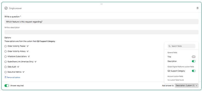 Currently, the workaround is to not use the custom field to populate this question and to have separate blueprints for each of the markets - that works, but it's messy and leaves room for error having to remember that there are multiple blueprints for this request form when updates need to happen.