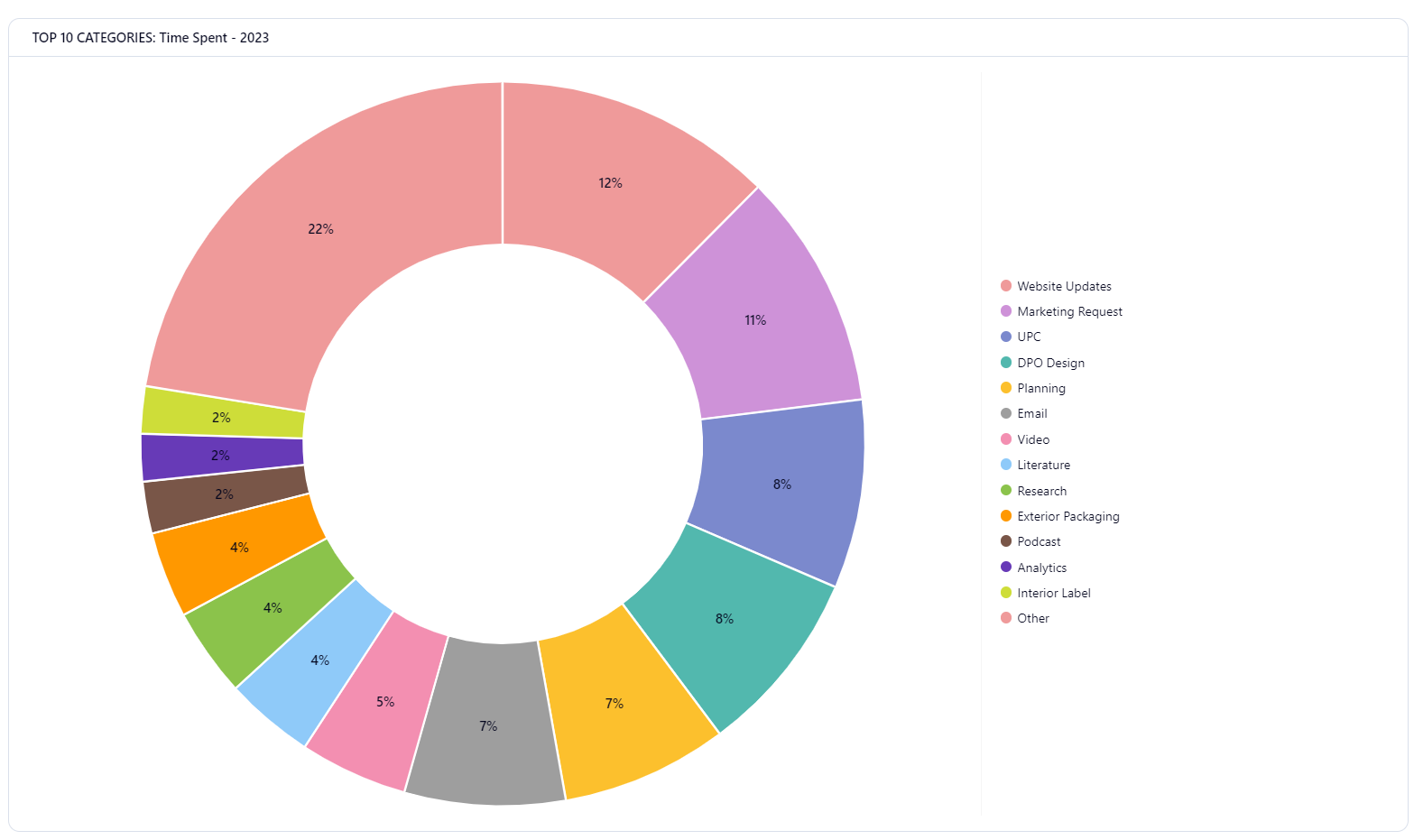 We are using the new dashboards pie charts and bar graphs to show a visual representation of the Top projects and categories tracked based on time spent. Our Leadership team only wants to see top 10 - I can hide other categories/projects using the pie chart but anytime you refresh the dashboard it reverts back to the full list. ALSO having all the data in these charts increases load times. The ability to break down the data even more would be super beneficial. Also the ability to show the hours spent next to the percentage without having to hover.