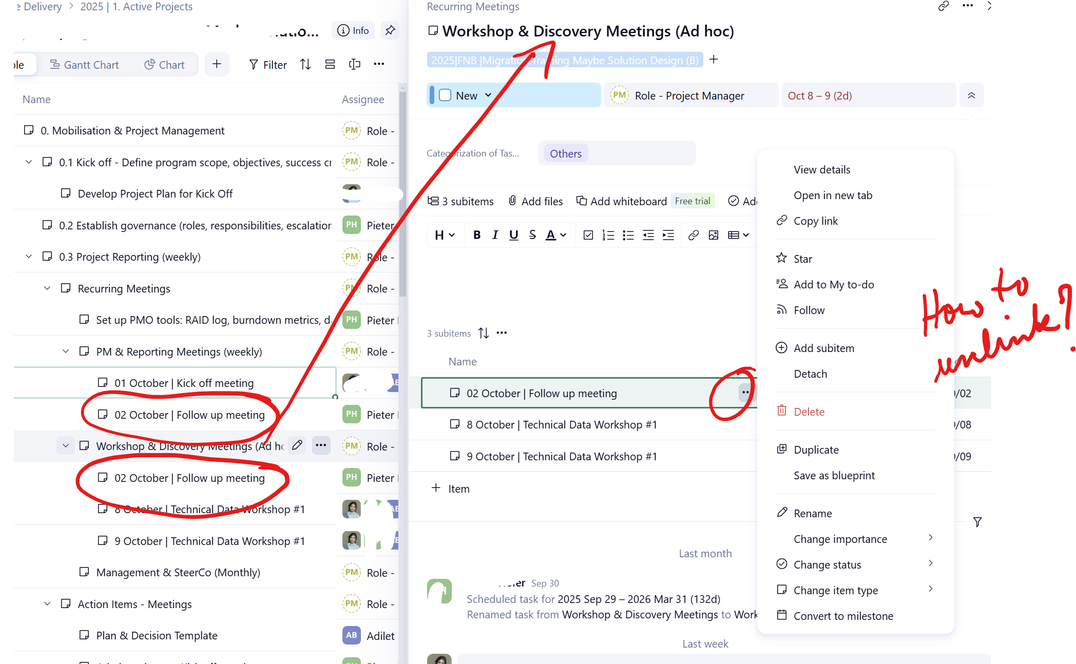 Sorry for the delay in getting back to you. To unlink the subtask, you can use the Detach option from the three-dot menu ๐๐ผ.Please give it a try and let me know if you have any questions.