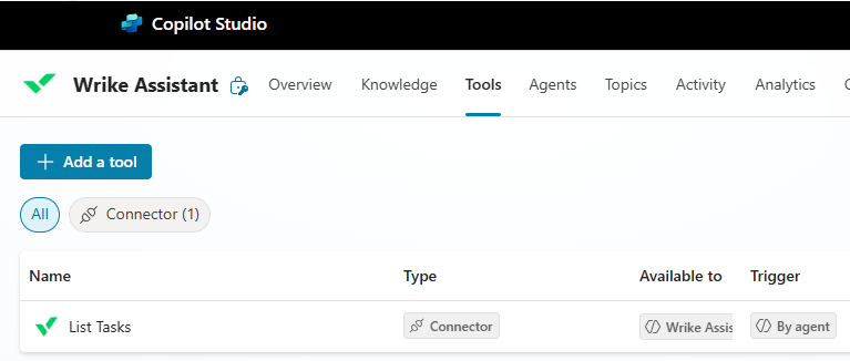 Once done, I've created an agent with Copilot Studio to which I added Wrike Tools (here only one for the test):