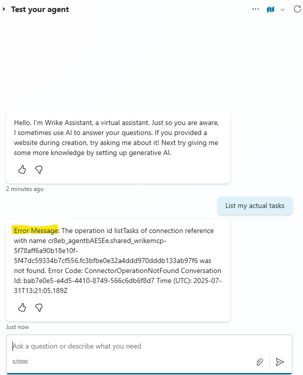 Hello, I think I've managed to link Wrike to the Copilot Studio environment. But I'm stuck.