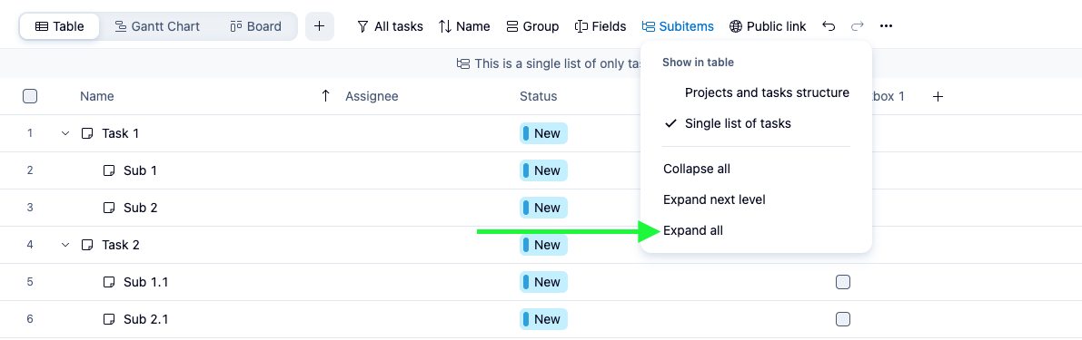 Subitems are not shown in "Single list of tasks" mode of "Subitems" menu