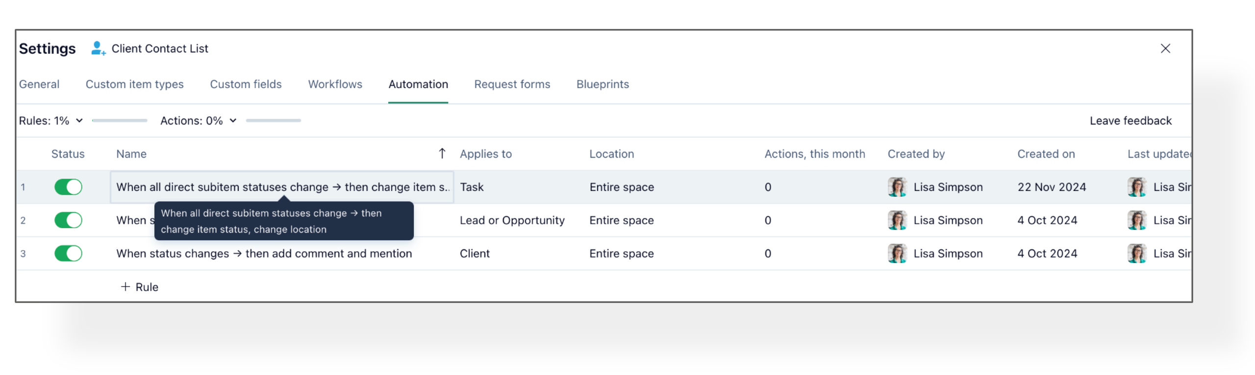 Upvoted! Sabiha Kelesoglu couldn't agree more, I am surprised it isn't a thing already. I to find myself having to open each automation rule to see what's included and it's time-consuming when we have tons of rules on a space. Allowing us to expand and resize the automation Name column would be great, or at least if the platform would wrap text by default.