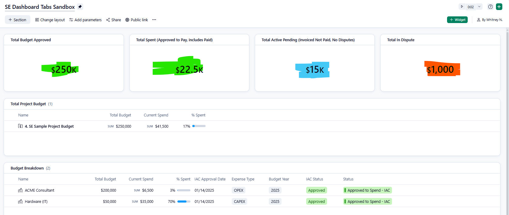 Thanks Tiffany and Basudha Sakshyarika! This is super quick and dirty but I'd love something even as simple as being able to control the font and background color of the widgets themselves. Sometimes I have a metric that is always a "bad guy" in this case how much of a project's overall budget is currently in dispute - I want those to be red. I might want my pending but fine metrics to be blue, and the others green.