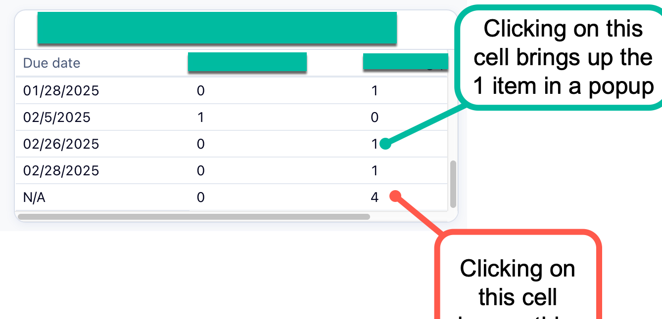 When creating a Pivot Table dashboard widget, you select 2 fields to break and group by - thus creating the pivot table! When setting the location, if an item exists there but is missing 1 of 2 fields, the line item will show as N/A. All other cells in the pivot table can be clicked on and doing so will bring up the filtered work in a popup. Clicking on the N/A cell does not bring up a popup, thus making it difficult to locate these issues.