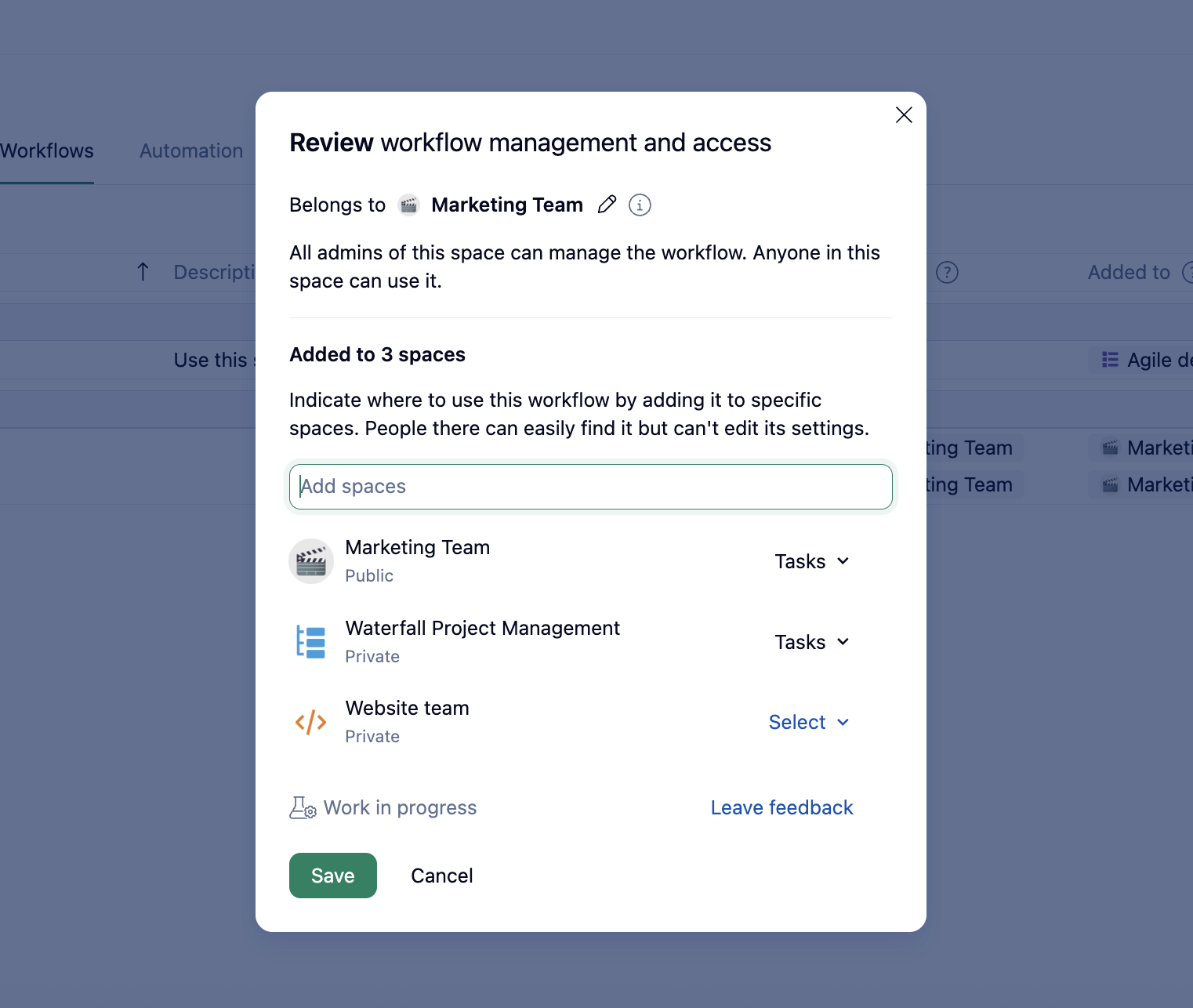 - Note: Adding workflows to other spaces lets people use the workflow in those spaces, but doesnโt automatically grant management rights to other spaces.