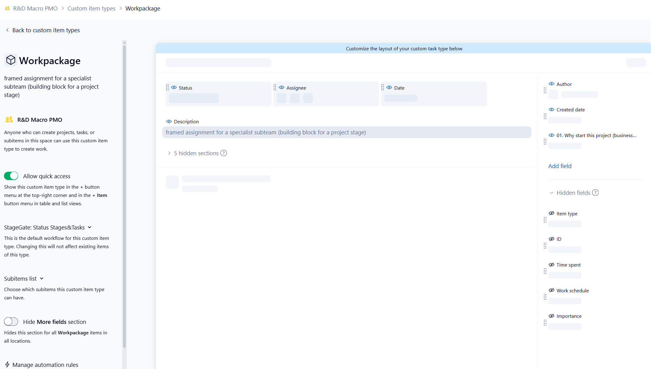 - We have item types to represent sub-projects (e.g. Epic, Work Package, Phase, etc.). There are custom fields like Customer, Strategic Goal, etc. that we'd like to apply only to our top-level project item types but not the sub-project types to reduce inadvertent filling by engineers.