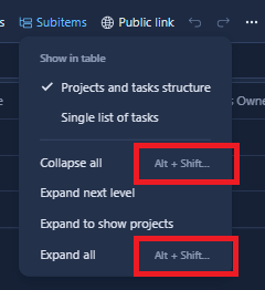 In views, for the "Subitems" menu, the "Collapse all" and "Expand all" options display a shortcut, but it is truncated, regardless of browser zoom level: