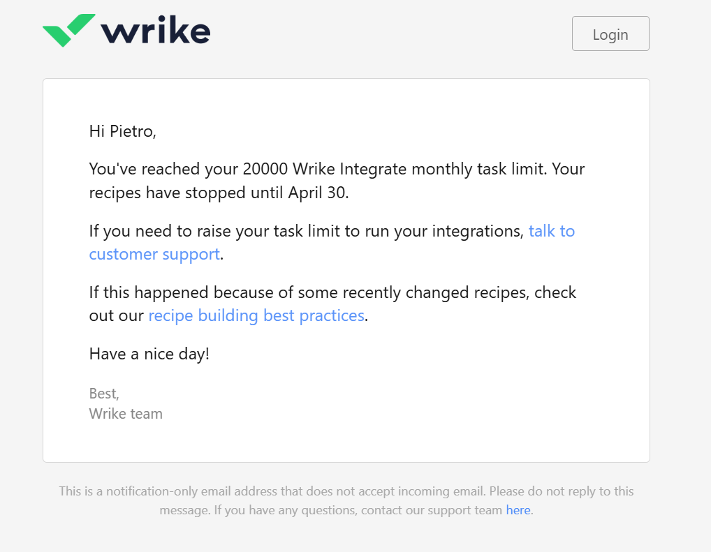 So I need to open all my accounts, in this case, with Wrike Integrate to find which one is out of actions.