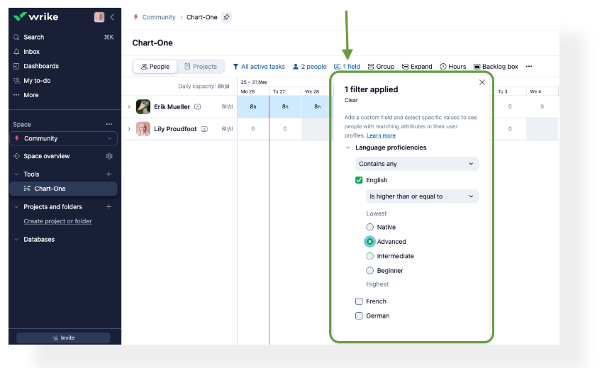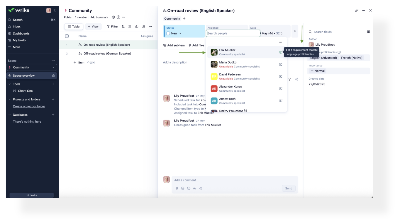 - When you specify a skill requirement for a task, Wrike will automatically suggest people with the required skill level or higher at the top of the list. Those who have the skill, but at a lower level than required, will appear next. Individuals without the skill will be listed further down.