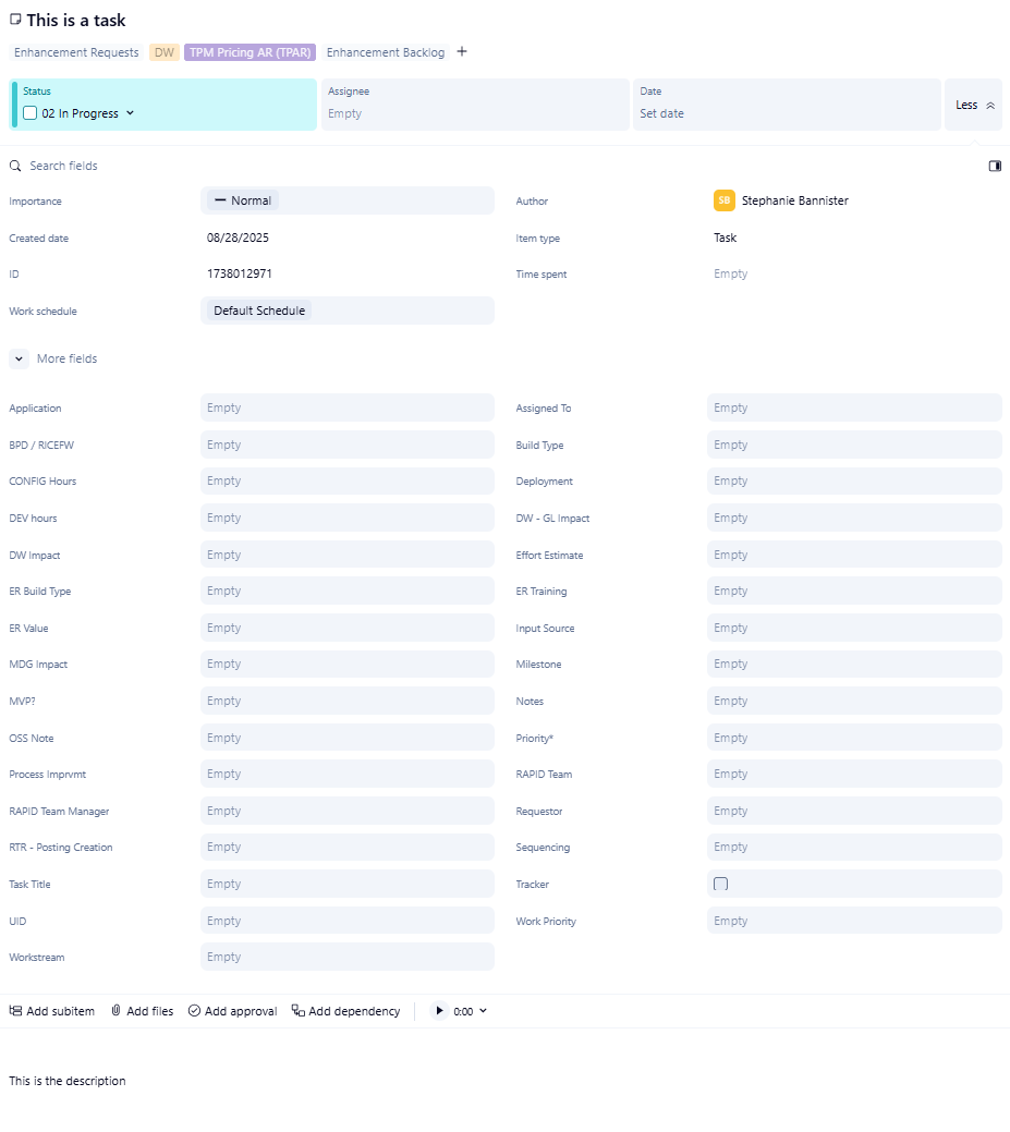 Below is what a new user will see by default on a new task - all before they get to the description. I know we should clean up our custom fields, and we're working on that. I also know we can train people to collapse the "more fields" section and toggle to the side pane view which will help them get to the meat of the item faster. But first impressions are everything. When people encounter an overload of information as they're trying to learn a new system while also getting their regular work done, it's overwhelming and discouraging. We have a wide range of users in Wrike and being able to control this would go a long way in helping teams both inside and outside of IT be comfortable with the tool.