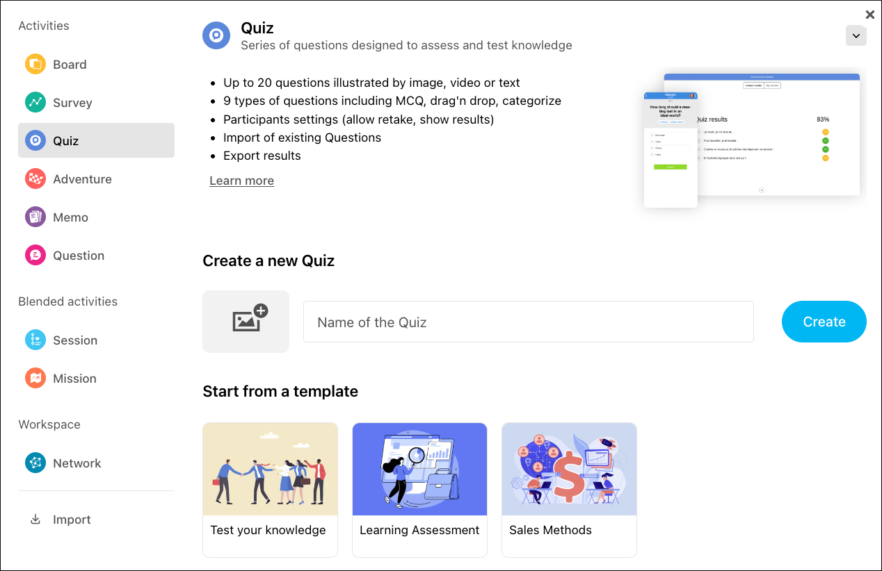 With its timed questions, rankings, and different formats, the Quiz is ideal for validating what’s been learned, leading a training session in a fun way, or simply checking your audience’s understanding of a topic.