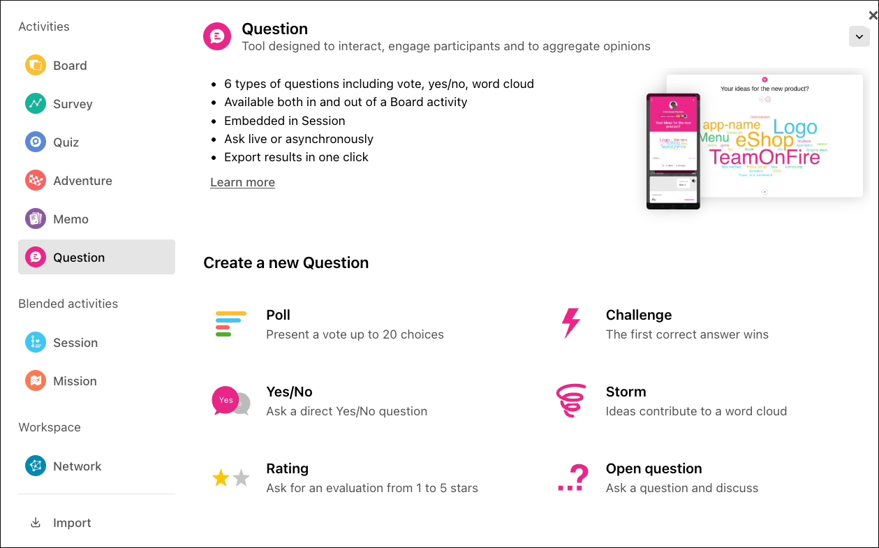 A: Use Survey for structured feedback (ratings, votes, MCQs). Use Question to spark open input or a word cloud.