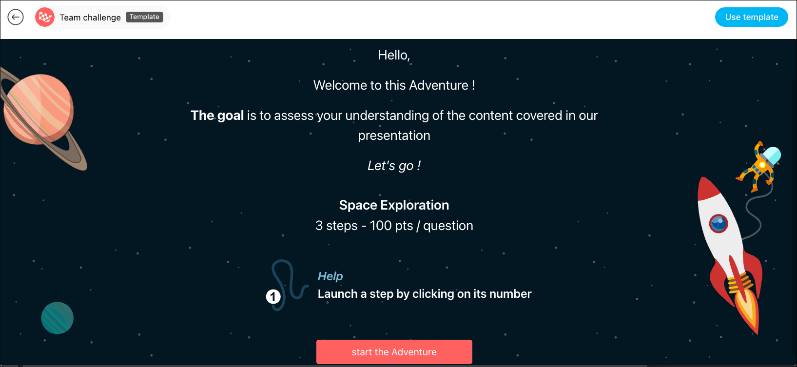 The Adventure transforms your content (videos, presentations, quizzes) into a gamified journey. Participants progress at their own pace through different stages, earn points and follow a story. This is excellent for online training (e-learning).