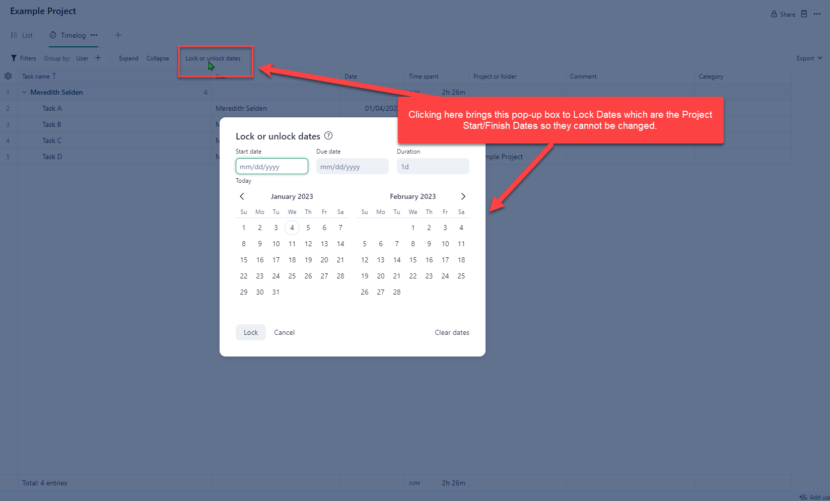 Meredith Selden  This lock feature is not related to the project dates at all. This is for locking time logs on certain date ranges. For example, if you do billing at the end of the month, you don't want to allow someone to log more time during that month after you have processed billing for the month, so you lock that date range so no TIME LOGS can change.