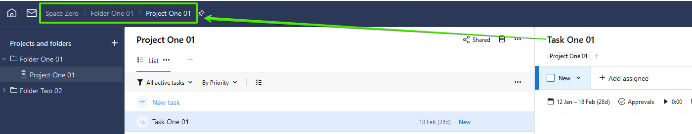 So when I share a folder with someone, like the Design Tasks folder, but they don't have access to any other folders. when they see it in their panel, it will only say "Design Tasks," but when they click on it... above the LIST panel it will show the folder name "Design Tasks" and smaller below it, it will show the path and highlight in some way the project it comes from.