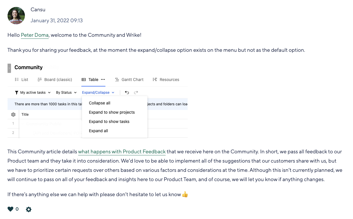 After switching to Lighting, we are seeing this become more of an issue where we definitely need the ability to set this default Expand/Collapse. It is sad that I am adding this information on the community forum where Wrike is already throwing in the towel saying that it is not Planned to be implemented. This is the second time Community Forums has let me down and wasted my time. I thought we wanted to make this platform better and more user friendly for all users?
